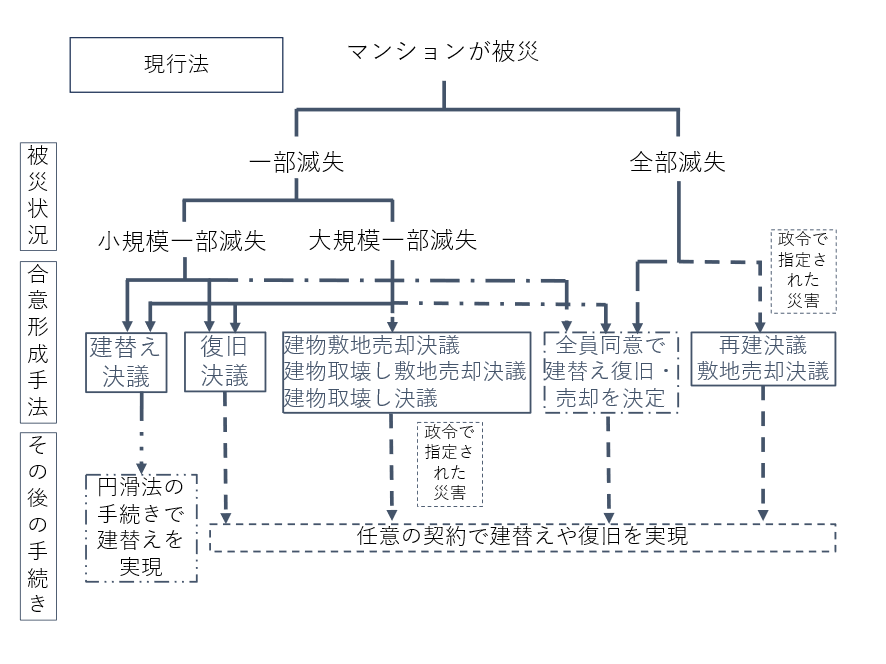 既存の区分所有法は、区分所有建物と附属施設及びその敷地の管理等について定めたものとなっています(区分所有法3条)。そのため、災害等によりマンションが滅失(建物としての機能を失なった状態)してしまうと、区分所有法が適用されなくなります(区分所有建物がなくなるので、区分所有法は適用されないという理屈です。)。
