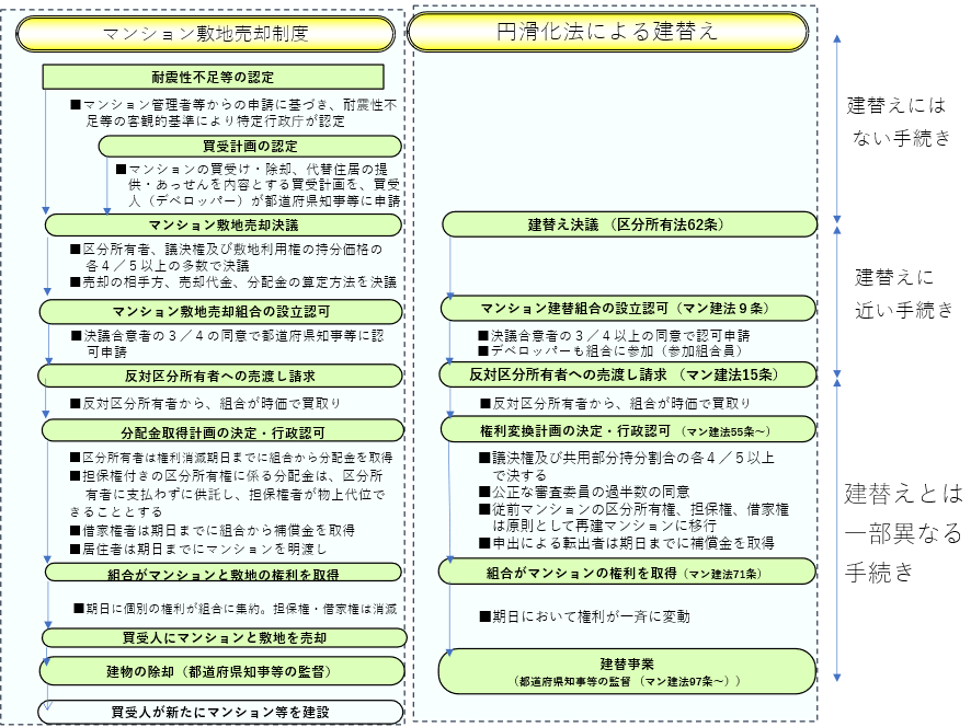 さて、現在の区分所有法では、再生に関しては「建替え」の規定しかありません。「マンション敷地売却決議」は円滑化法上の規定であり、区分所有法の規定ではありません。また、マンション敷地売却を進めるときは、予め特定行政庁から「特定要除却認定」を取得するとともに、管理組合で買受人(最終的にマンションと敷地を購入する者)を選定したうえで、買受人が市区長から「買受計画」の認定を受けなければいけません。建替えの手続きとマンション敷地売却の手続きのフローを比較すると図1のようになります。